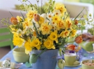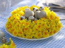 Желтые нарциссы напоминают цыплят, которых изображают на открытках. Букеты цвета солнца можно делать с свежих цветов или вазонов. В праздничные венки вплетают шитые собственноручно игрушки, картинки из бумаги, дерева и ленты зеленого и желтого цветов. А в композиции с цветами вкладывают куриные и перепелиные яйца, покрытые серой краской.
