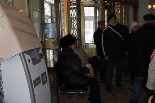 За первые полчаса работы в субботу, 21 января, отделение на проспекте Правды, что на Виноградаре, выстроилось в очередь из 32 клиентов. Их обслуживает один кассир.