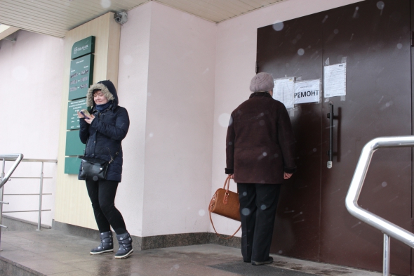 На дверях отделения на улице Борщаговской написано большими буквами "Ремонт". Он длится с 26 декабря. С тех пор сотрудников перевели в помещение "Ощадбанка" на бульваре Шевченко.