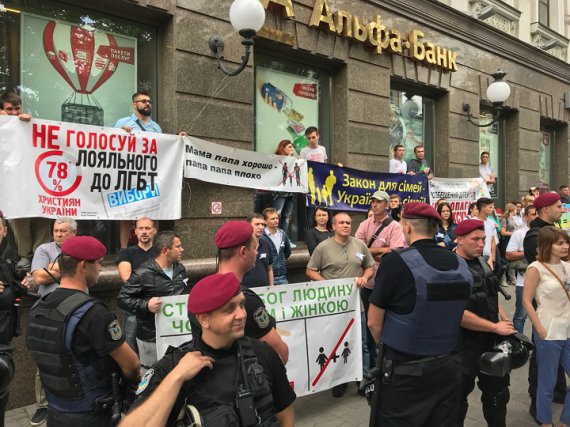 Задержание также произошли и возле Оперного театра. Здесь противники скандируют "Украина - не Содом" и "Кличко, Киевсовет мы против гей-парада".