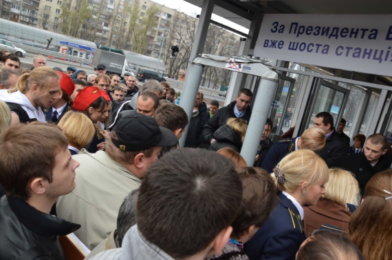 Виктор Янукович опоздал на 15 минут. Вместе с ним прибыл министр инфраструктуры Василий Козак и заместитель председателя КГГА Михаил Костюк. Для президента посреди платформы оборудовали сцену с трибуной.