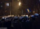 "Беркутовцы" расположились шеренгой на всю улицу в три ряда со щитами. Напротив них - несколько десятков молодых людей с желто-синими лентами на руках. Также присутствуют до двух сотен митингующих с Евромайдана, что топчутся в нескольких метрах.