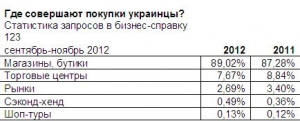 Около 8% сразу идут в торговый центр (наиболее популярны - Караван, Дрим Таун). Рынки интересуют около 3% людей. Сэконд-хэнд используют для покупок 0,5% украинцев (самый популярный - Хумана). Стоит отметить, что по сравнению с прошлым годом усилились позиции торговых центров, немного чаще украинцы стали посещать и рынки. А вот позиции магазинов и бутиков немножко ослабли, также меньше украинцы стали посещать секонд-хенды.