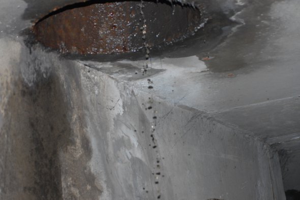 Далее идем по ровному бетонному коридору. Преодолеваем еще две трубы, закрепленные ниже, чем первая. Из отверстий в стене струится вода. Кое-где видны канализационные люки, из которых скапывает дождь.