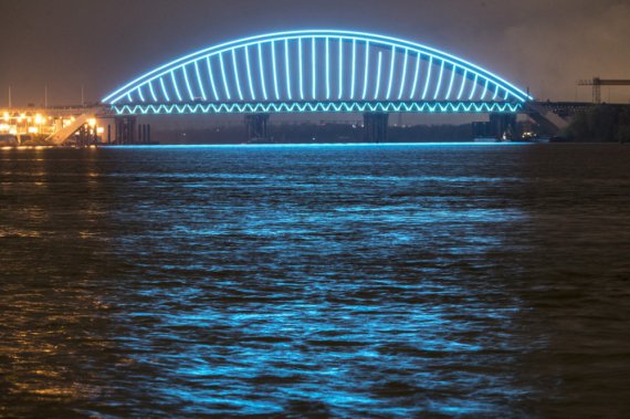 В эти выходные показали, как будет выглядеть вечером и ночью Подольско-Воскресенский мост Киева с новой подсветкой.