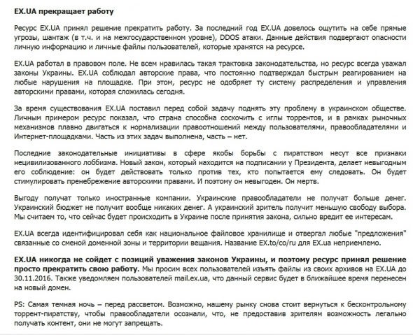 "Ресурс EX.UA принял решение прекратить работу. За последний год EX.UA довелось ощутить на себе прямые угрозы, шантаж (и на межгосударственном уровне), DOS-атаки. Данные действия подвергают опасности личную информацию и личные файлы пользователей, которые хранятся на ресурсе. EX.UA работал в правовом поле. Не всем нравилась такая трактовка законодательства, но ресурс всегда уважал законы Украины. EX.UA соблюдал авторские права, что постоянно подтверждал быстрым реагированием на любые нарушения на площадке. При этом, ресурс не одобряет ту систему распределения и управления авторскими правами, которая сложилась сегодня", - сообщается в заявлении.