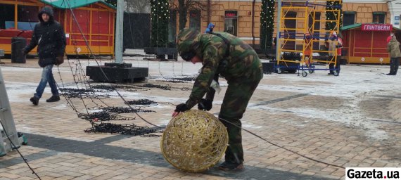 С елки снимают декорации и гирлянды. Последние сматывают и складывают в большие ящики, сообщает корреспондентка Gazeta.ua.