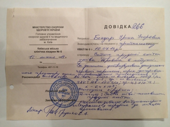 Ирина Бондар - активистка КУПР, которую якобы ударил сотрудник милиции на рынке "Щлях", что в Святошинском районе Киева, - поступила в больницу с ушибом грудной клетки. Об этом сообщил УНН источник в Киевской городской больнице № 6.