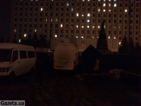Территория вокруг здания заставлена автомобилями. Здесь проводится ярмарка. Центральный вход заставлен грузовиком. В середину пускают только сотрудников.