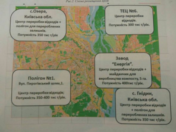 Центры переработки отходов разместят на заводе "Энергия" в Киеве, где появится полигон для переработанных остатков. Также на ТЭЦ-6 в Деснянском районе Киева, там осуществят переработку органического мусора. В Голосеевском районе Киева на полигоне №1 на ул. Пироговский путь, 1. В селах Гнедин и Озера Киевской области.
