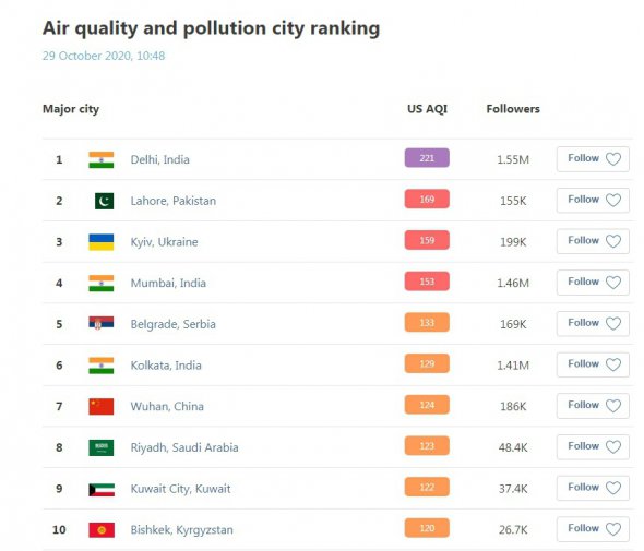 Утром 29 октября Киев оказался на 3-м месте в мировом антирейтинге городов с высоким уровнем загрязнения воздуха.