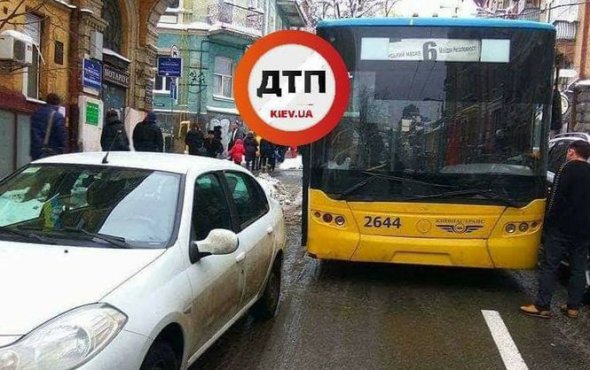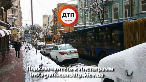В центре Киеве 22 декабря людям пришлось перетаскивать автомобиль Nissan, который заблокировал движение троллейбуса на ул. Софиевской.