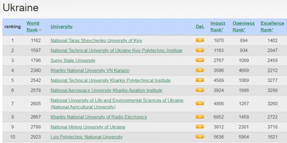 Национальный университет им. Тараса Шевченко и Национальный университет "КПИ им. Игоря Сикорского" возглавили топ-10 украинских университетов по уровню присутствия в сети. В мировом рейтинге вузов они заняли 1162-е и 1597-е места.