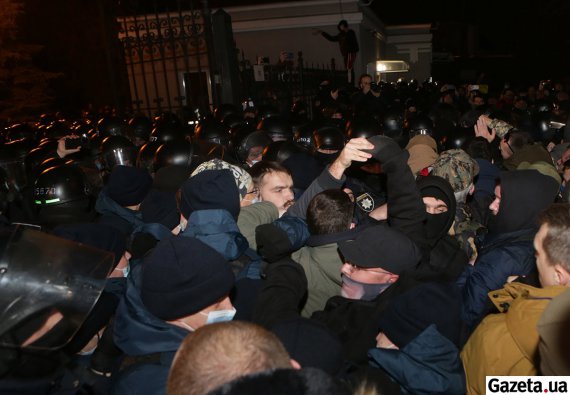 В конце концов, правоохранители начали пропускать в ОП людей по одному - после проверки на входе. Участники акции продолжали скандировать "Зелю вон!". Требовали уволить главу Офиса президента Андрея Ермака с должности.