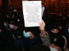 Люди резко оживляются, когда около 20 активистов спускают с моста на торгово-развлекательный центр "Глобус" огромный баннер с изображениями Андрея Ермака и Владимира Зеленского. Есть надпись: "Их ложь унижает. Защитим наше достоинство". Толпа внизу аплодирует, снимает баннер на фото и видео.