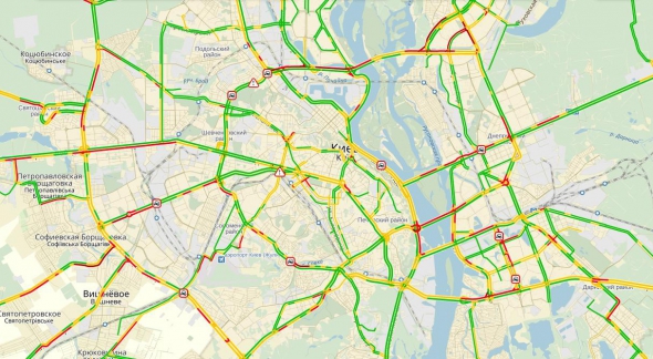 Проблемы с движением транспорта также на въездах в город. Со стороны Житомира транспорт фактически остановился. На Гостомельском шоссе скорость не выше 15 км/ч. Из Броваров добраться до Киева можно не быстрее 30 км/ч.