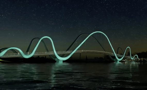 Длина моста - 130-140 м. Его конструкции выполнят в виде волн. Они поднимаются к центру и "затихают" ближе к краям конструкции. Мост будет иметь подсветку.