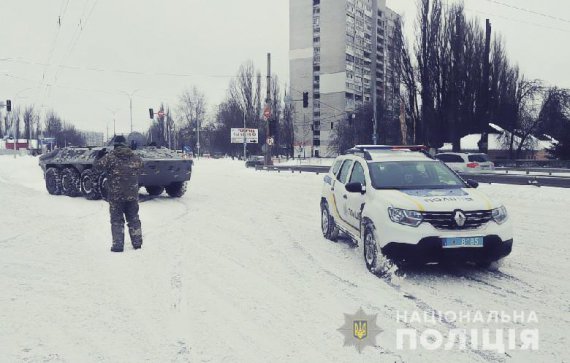 Привлекли также тракторы и ведомственные автомобили, сообщила пресс-служба полиции Киева.