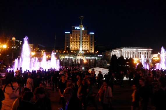 К большому фонтану подходит мэр Киева Виталий Кличко. Присутствующие вслух ведут обратный отсчет. Над площадью раздается песня украинской певицы Росавы "Як тебе не любити". Под водой зажигаются фонари, с фонтанов начинают бить струи.