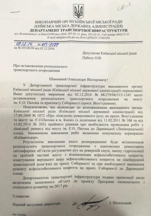Он обнародовал письмо Департамента транспортной инфраструктуры. В документе говорится о том, что горадминистрация инициирует установление распределительного транспортного ограждения и демонтаж светофорных объектов, регулирующих движение на реверсной полосе. Также КМДА собирается заменить гидроизоляцию на мосту с последующим ремонтом асфальтового покрытия до Дарницкого площади.