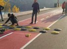 Вчера, 27 октября, на Пешеходном мосту, ведущем на Труханов остров столицы, на велосипедной дорожке неизвестные активисты самостоятельно установили средства успокоения движения.