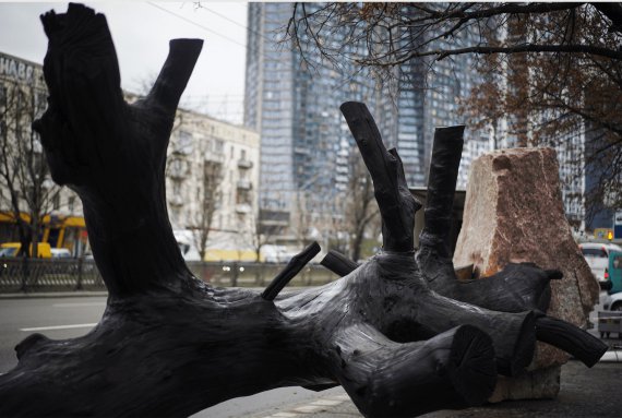 "Инсталляцию составляют 2 каменных валуны природной обработки, между камней лежит дерево. В каменные стелы вмонтированы моноочки с фотографиями. Они принадлежат немецкому военному фотографу-пропагандисту Иоганнесу Хэле, который осенью 1941 года в оккупированном Киеве сделал серию цветных снимков", - говорится в сообщении.
