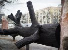 Образ дерева с загнутыми ветвями, использованные в инсталляции, - это метафора прерванной жизни.