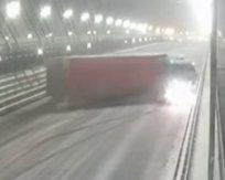 Утром в пятницу, 15 января, на Южном мосту Киева занесло грузовик. По словам водителя, он не справился с управлением из-за сложных дорожных условий.
