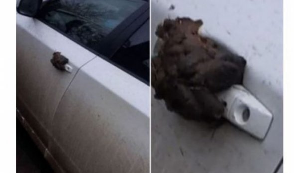 В Киеве неизвестные проучили "героя парковки", прилепив к водительской двери, вероятно, фекалии.