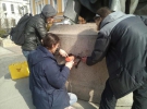 В столице на углу ул. Владимирской и бул. Тараса Шевченко ограбили память памятник Михаилу Грушевскому. С постамента исчезла бронзовая надпись "М. Грушевський".