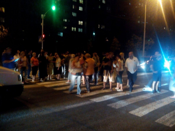 Около полусотни человек ходят по пешеходному переходу и не пропускают авто и общественный транспорт. Требуют остановить строительство на кольце Героев Днепра.
