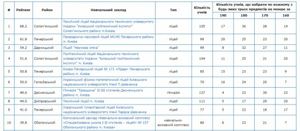 Верхушку составленного Образовательным агентством города Киева рейтинга возглавили лицеи. Первое место, в частности, занял технический лицей Национального технического университета "Киевский политехнический институт" в Соломенском районе. 36 его выпускников из 105 набрали не менее 180 баллов по каждому из трех предметов ВНО.