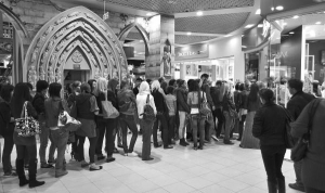 После полуночи возле магазина "Пума" собирается 200 человек. За раз запускают по 30 человек. Чтобы не заснуть, люди пьют энергетические напитки. Их за полцены распродают в продуктовом магазине "Новус" на первом этаже. Елена Гричишина, 29 лет, примеряет серую куртку.