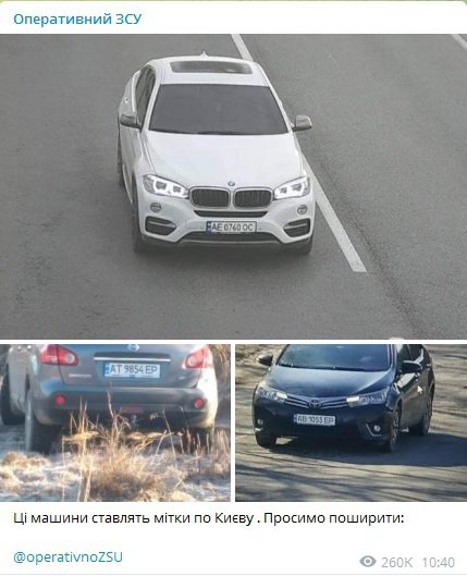 "Эти машины ставят метки по Киеву. Просим распространить", - говорится в сообщении.