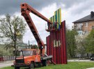 На последних кадрах видно, что коммунистическую звезду сняли, а стелу с помощью спецтехники перекрасили в национальные сине-желтые цвета.