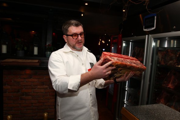 - Чтобы стейк был мягким, нежным, сочным, мясо держим в камерах с определенной температурой от 20 до 60 дней. Излишняя влага выходит, а вкус концентрируется. Происходит ферментация. По сути - это первая стадия гниения, которая дает нам сочный стейк. Это контролируемый процесс, он безопасен, - киевский ресторатор 39-летний Дмитрий Борисов показывает одно из своих заведений, украинский карпатский мясной ресторан Vatra.