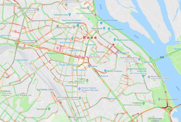 В частности, на правом берегу тянутся бульвар Леси Украинки и Тараса Шевченко, улицы Михаила Грушевского, Институтская, Шелковичная, Кловский спуск, Крещатик, Бассейная. На левом - стоит в пробке проспект Николая Бажана от станции метро Позняки до Южного моста, говорится в сервисе Google Maps.