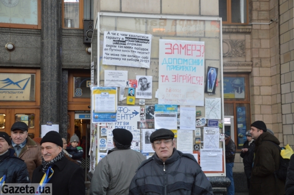 Колонны Главпочтамта после Оранжевой революции 2004 года застеклили. На них сохранились надписи тех времен с лозунгами и подписями. В 2010 году надписи частично закрасили, но все же часть оставили. Сегодня это место для объявлений - здесь можно найти попутчиков, чтобы поехать домой или найти место для ночлега.