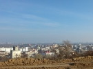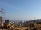 Один из склонов древней горы сейчас выглядит как выровняный трактором участок. Везде глина, песчаные горы. На территории стройплощадки стоит вагончик для рабочих, рядом - собачья будка. Черная собака на цепи прыгает вокруг нее, добродушно виляет хвостом и заигрывает с людьми.