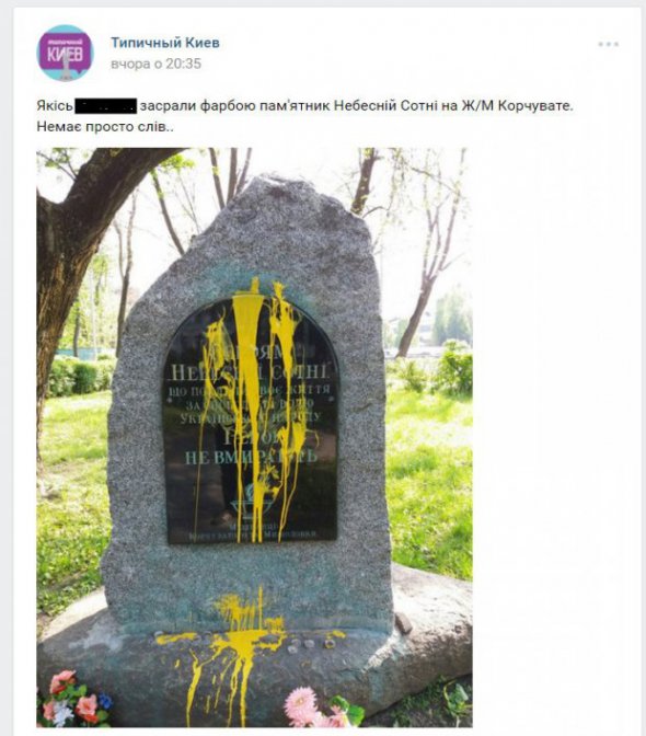 Облили желтой краской памятник героям Небесной сотни на территории Голосеевского р-на, в микрорайоне Корчеватое.