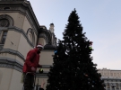 5-метровая искусственная елка появилась на Театральной площади возле Национальной Оперы Украины благодаря волонтерам и пожертвованиям неравнодушных граждан. На елку, ее монтаж, демонтаж и игрушки собрали более 13,5 тысяч гривен. Звезду для елки подарила декоратор-флорист Маричка Казимирук.