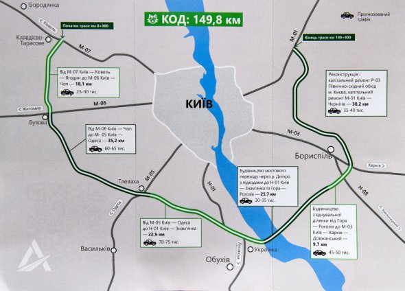 Она будет иметь шесть участков и соединит трассы М-07 Киев — Ковель, М-06 Киев — Чоп, М-05 Киев — Одесса, Н-01 Киев — Знаменка, Н-08 Борисполь — Мариуполь, М-03 Киев — Харьков и М-01 Киев — Чернигов. Также планируют построить мост с подходами протяженностью более 25 км через Днепр.