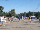 На площади работают коммунальщики Шевченкивського раайону. Убирают мусор волзе бывших торговых точек.