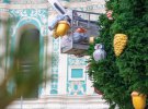 Центральную елку Подола расположили традиционно на Контрактовой площади. Ее украсили тарелками с петриковской росписью, яблоками и орехами. На площади также смонтировали каток и горки для взрослых и детей.