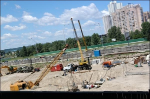 На окруженной забором стройплощадке видно пять кранов. Суетятся строители в оранжевых касках. Выходят ремонтники "Киевметростроя", чтобы поесть. Рядом стоит машина с продуктами: женщина делает бутерброды и разливает чай.