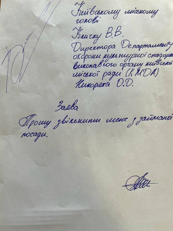 Городской голова Киева Виталий Кличко подписал заявление об увольнении директора департамента охраны культурного наследия Киевской городской государственной администрации Александра Никоряка.