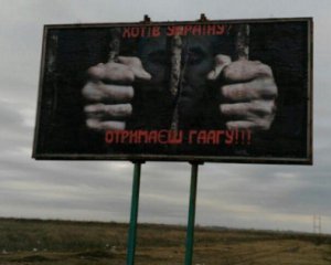 На билборде с Путиным написано: "Хотел Украину? Получишь Гаагу".