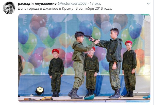 "То, что произошло в Керчи, это результат тотальной милитаризации детского сознания, которая насаждается в Крыму в последние годы, - считает крымскотатарская поэтесса Лиля Буджурова. - Все эти выставки военной техники на центральных площадях городов, где детей сажают за зенитки и учат обращаться с автоматом. Интересно, что в головах у тех людей, которые дают в руки детей "игрушки", которые предназначены для убийства ".