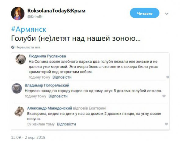 "Обстановка во время химической атаки. Почти 10 дней. На газонах появились мертвые птицы", - пишет блогер RoksolanaToday & Крым в Twitter.