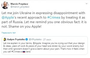 Пшедач напомнил компании, что Крым - это территория Украины, а также выразил разочарование тем, что в Apple об этом не знают.